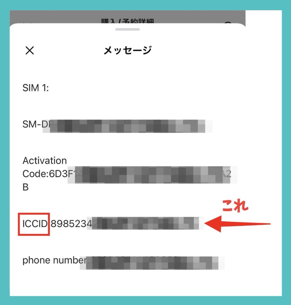 例えば、代表者が4人分のeSIMを購入した際でも、このメッセージを開くと、SIM1、SIM2…と情報が記載され、それぞれICCIDも人数分あります。
